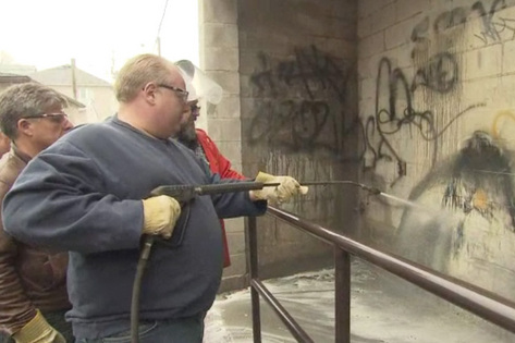 4月7日,Dufferin Street附近的St. Clair Avenue West,市長福特(Rob Ford)身穿毛衣和牛仔裝,卷起袖口在街頭使用洗滌器清洗墻上的涂鴉。
