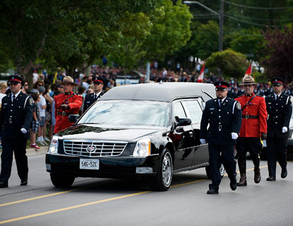 當(dāng)靈車(chē)及護(hù)送車(chē)隊(duì)抵達(dá)位于NewMarket的Upper Canada Mall后,在該處集合的逾六千名加、美兩國(guó)警隊(duì)警察、約克區(qū)消防和救護(hù)隊(duì)員及加國(guó)軍人,便開(kāi)始沿著央街(Yonge St)兩側(cè)以整齊的方陣列隊(duì),向尾隨的靈車(chē)及護(hù)送車(chē)隊(duì)致敬。靈車(chē)及護(hù)送車(chē)隊(duì)最后駛到葬禮的舉行地點(diǎn)Ray Twinney Recreation Complex康體中心。