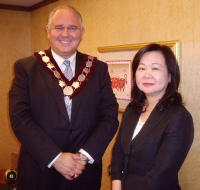 (從萬錦市的無酬義工到市府資深商業(yè)發(fā)展官員的譚貴瓊(右),被萬錦市長薛家平(左)喻為“華人擔(dān)任公職的極佳范例”。)