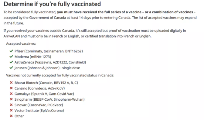 A:根據(jù)加拿大政府的規(guī)定,“完全接種”的定義是指完全接種加拿大認可的疫苗滿14天。