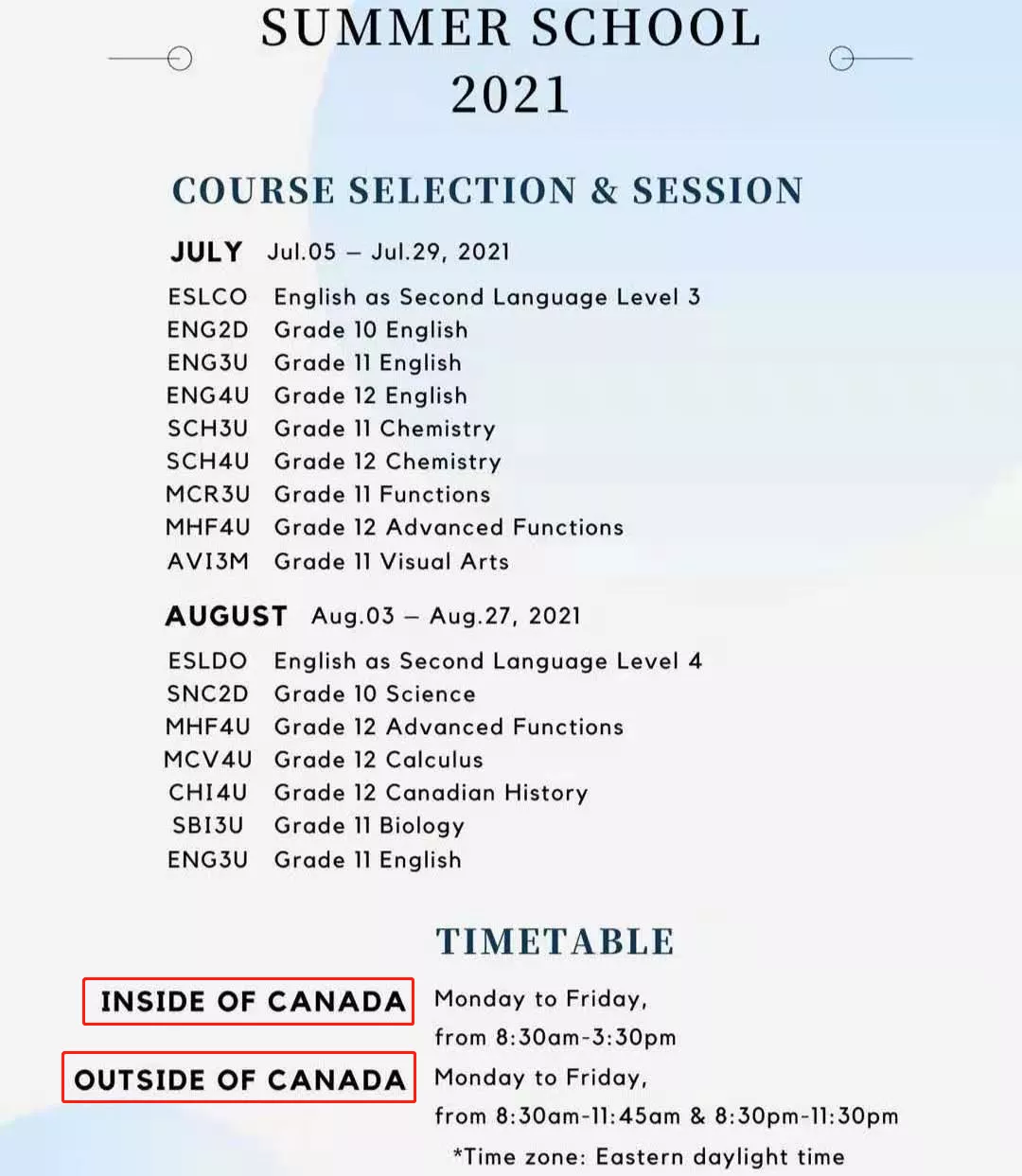 私立高中一般7月8月都有開課,而且有些國際學(xué)校針對(duì)這次疫情很多同學(xué)在國內(nèi)上網(wǎng)課的情況,還會(huì)有專門給國內(nèi)同學(xué)設(shè)置的上課時(shí)間,不需要熬夜,比較人性化: