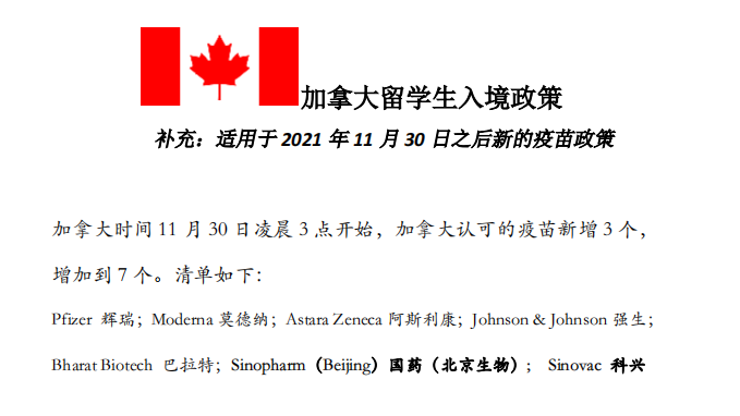 從2021年11月30日起,加拿大將擴大其認可的入境旅客須接種的新冠疫苗清單,其中包括中國的國藥集團(Sinopharm)和科興(Sinovac)疫苗,與世界衛(wèi)生組織的新冠疫苗緊急使用清單相匹配。即從11月30日起,同學(xué)們只要注射完2針國藥或者科興的疫苗14天后將被加拿大視為完全免疫,將在入境的時候享受免隔離政策,同時也可以在加拿大境內(nèi)搭乘飛機和火車。