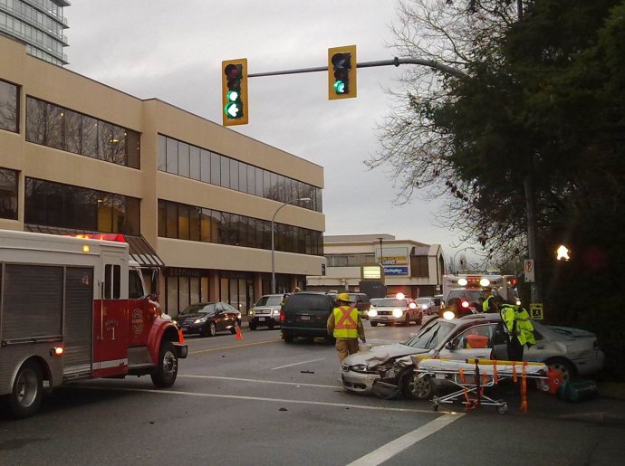 圖3:列治文街頭的一起交通事故,圖中間那輛綠色旅行車把左側(cè)這輛小轎車撞上了便道,小轎車司機(jī)已經(jīng)準(zhǔn)備上擔(dān)架了。
