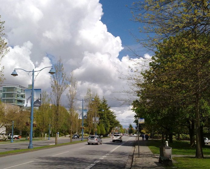 圖4:溫哥華的干線街道,路不寬,車也不多??纯刺焐系陌自疲谶@樣的天氣里開車一定感覺很爽。