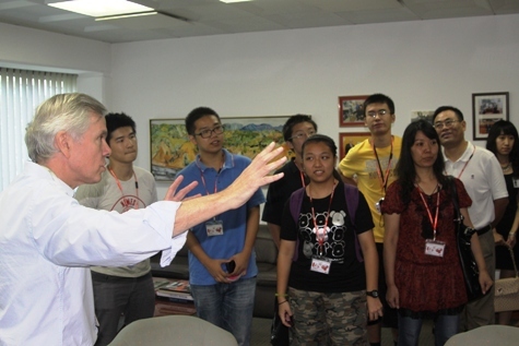 20日清晨,馬大維大使親自驅(qū)車到獲獎(jiǎng)?wù)呦麻降馁e館迎接他們,短短幾分鐘車程后,使館就進(jìn)入了大家的視野。大使很高興地帶大家來(lái)到他的辦公室,并一一講解每一件陳設(shè)及照片的意義,甚至邀請(qǐng)獲獎(jiǎng)?wù)邆冏谒?ldquo;寶座”上,過(guò)一把當(dāng)大使的癮。