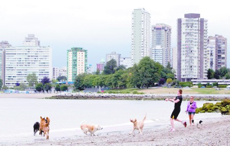 溫哥華的全球最適宜居住城市地位不保﹐一些居民不明白為何降到排名榜的第三位。圖為民眾7月27日帶家犬﹐到溫哥華的英吉利灣(English Bay)沙灘玩耍。