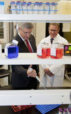 沙斯卡其旺大學建成北美最先進疫苗中心,并于16日首次開放,總理哈珀(左)蒞臨參觀。