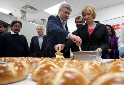總理哈珀(前左)和太太勞琳在密西沙加一家麵包店參與製作復(fù)活節(jié)麵包,展現(xiàn)親民作風(fēng)。