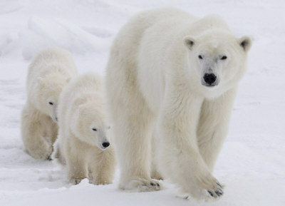 聯(lián)邦政府打算把北極熊列為受法律保護(hù)的物種。2007年緬尼托巴省哈德遜灣地區(qū),北極熊媽媽帶領(lǐng)著兩只熊寶寶徜徉在冰原上。