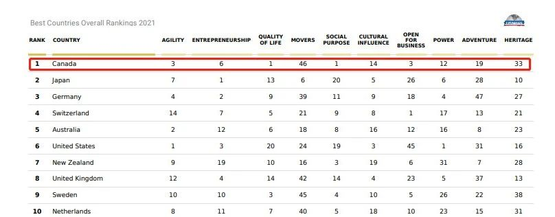 近日U.S. News發(fā)布全球最佳國家排名(Best Countries 2021),在該綜合排名中,加拿大因?yàn)樯鐣康摹⑴泽w驗(yàn)、種族平等、發(fā)展前景、生活質(zhì)量等方面的優(yōu)秀表現(xiàn)而排在全球首位,成為全球最佳國家。